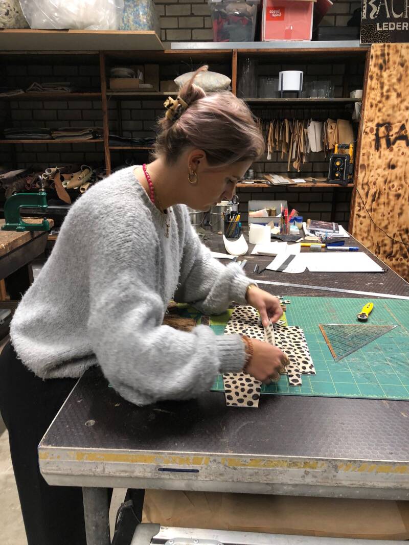 - De patronen worden met de hand uit het leer gesneden.
